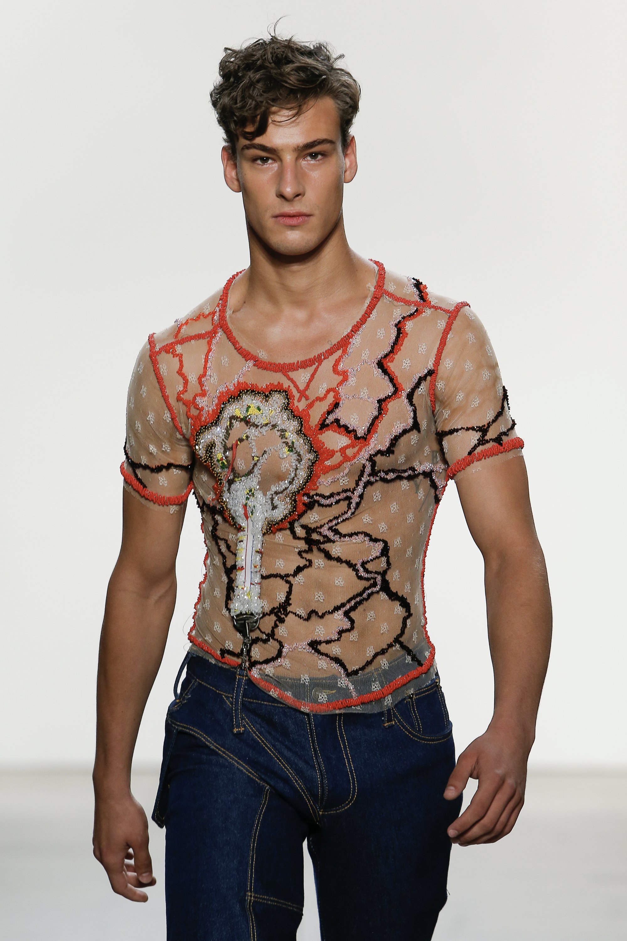 It was actually much more political than it was aesthetic. Every design choice that was made throughout the course of building this collection was based around revealing fictitious qualities of masculinity. Transparent lace was a perfect base fabric for certain garments because it was not only like a blank slate, but it also had an incredibly feminine connotation. Building on top of it with embroidery was a way of washing over that femininity, which was why most of the embroidery pertained to symbolic details within menswear. If I was making a t-shirt, for example, I would hand bead the ribs and wherever you would expect to see a serging stitch. In other places, however, the embroidery was meant to build unique pockets of exposure within transparent garments, so only very specific parts of the body were shown. In this case, the intention was to reveal the male body in a very unnerving way, so as to push the boundaries of what we might consider to be socially acceptable within menswear.